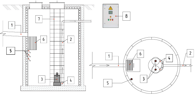 Сточные воды по подводящему трубопроводу (1) поступают в корпус КНС. На входе в станцию (6) установлена сороулавливающая корзина. В нижней части резервуара установлены насосные агрегаты погружного типа (3). Крепление насосов осуществляется через трубную муфту (4), которая крепится ко дну емкости шпильками. Перемещение насоса в случае его поломки осуществляется по штанговым направляющим (7), что значительно облегчает монтаж и демонтаж насоса. Включение/выключение насосных агрегатов происходит по сигналу датчиков уровня (5). В КНС применяются либо поплавковые датчики уровня, либо гидростатические. Управление и питание насосов осуществляется от автоматического щита управления (8) Сточные воды подаются насосами в напорный трубопровод (2) который выводит их за пределы насосной станции. Для возможности регулирования производительности насосов в КНС предусмотрено размещение запорно-регулирующей арматуры. Монтаж и демонтаж насосов осуществляется с помощью цепи, вручную или грузоподъемным механизмом.
